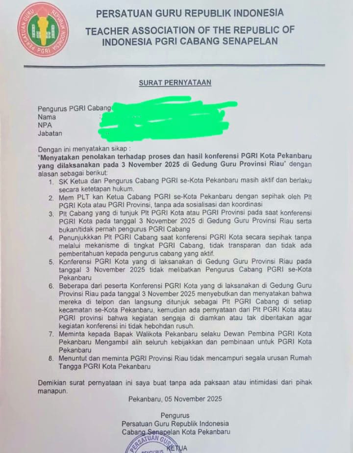 Nasionaldetik.com,— Buntut panjang atas kekecewaaan hasil pemilihan ketua PGRI kota Pekanbaru yang dilaksanakan pada tanggal 3 November 2025 lalu di Gedung Guru Rusli Zainal berujung tragis hingga 11 Pengurus Cabang yang sah dan masih aktif menolak dengan keras hasil konferensi PGRI.