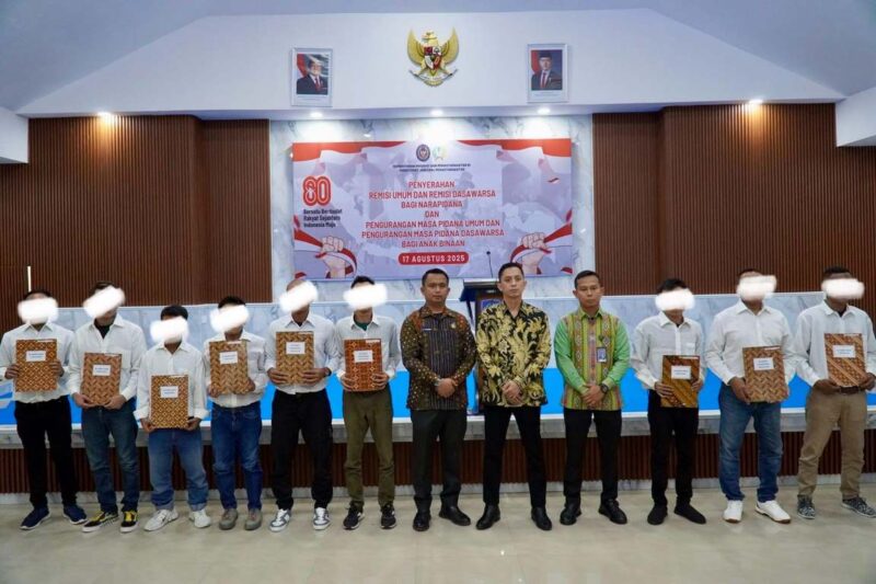 Medan – 17 Agustus 2025, usai melaksanakan Upacara HUT RI Ke-80 Kemerdekaan Republik Indonesia, Rutan Kelas I Medan melaksanakan penyerahan Remisi Umum dan Remisi Dasawarsa Tahun 2025 kepada Warga Binaan. Acara penyerahan dipimpin langsung oleh Kepala Rutan Kelas I Medan, Andi Surya didampingi Kepala Seksi Pelayanan Tahanan, Ronny Steven, Kasubsi Administrasi & Perawatan, Wisnu Jatmiko, beserta Staff.