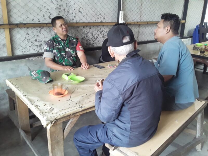 Babinsa Koramil 02/Sidikalang, Kodim 0206/Dairi, Serka Ajlian Putra melaksanakan kegiatan Binter dengan metode komunikasi sosial (komsos) bersama warga di warung milik Serma Purn TB Siahaan, salah satu tokoh masyarakat Desa Sitinjo II, Kecamatan Sitinjo, Kabupaten Dairi, Kamis (28/8/2025).