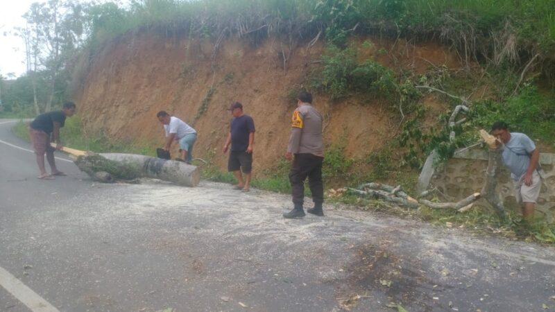 Personel Polsek Tigabinanga bertindak cepat menangani bencana alam berupa pohon tumbang yang menutup badan jalan di Desa Sukajulu, Kecamatan Tigabinanga, Kabupaten Karo, tepatnya sebelum Gereja GBKP Sukajulu Liang Melas Datas, Senin(29/9/2025).