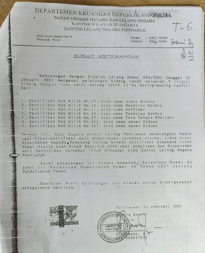 KLN mendaftarkan Surat Keterangan Pendaftaran Tanah (SKPT) di BPN pada 23 Januari 2001, dan lelang sudah dieksekusi dua hari kemudian, 25 Januari 2001.