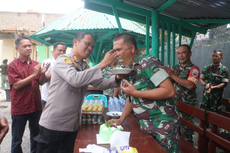 Kunjungan tersebut berlangsung di halaman Markas Koramil 02/Sidikalang di Jalan Sisingamangaraja, Kecamatan Sidikalang, Kabupaten Dairi. Kapolsek Sidikalang bersama Kapolsek Parbuluan membawa kue ulang tahun bertuliskan ucapan “Dirgahayu Tentara Nasional Indonesia ke-80 Tahun 2025, TNI Prima – TNI Rakyat – Indonesia Maju.” Momen penuh keakraban itu disambut dengan hangat oleh seluruh personel TNI dan Polri yang hadir.