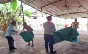 Namun, petugas menemukan dua lembar karpet warna hijau yang diduga digunakan sebagai alas arena sabung ayam dan langsung diamankan sebagai barang bukti sekaligus membersihkan barang-barang agar tidak digunakan lagi