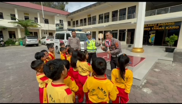 – Kamis, 6 November 2025, Polres Tanah Karo menerima kunjungan dari anak-anak Taman Kanak-Kanak (TK) Army Dolat Rayat sebanyak 15 orang. Kunjungan ini bertujuan memberikan edukasi sejak dini mengenai aturan dan rambu-rambu lalu lintas.