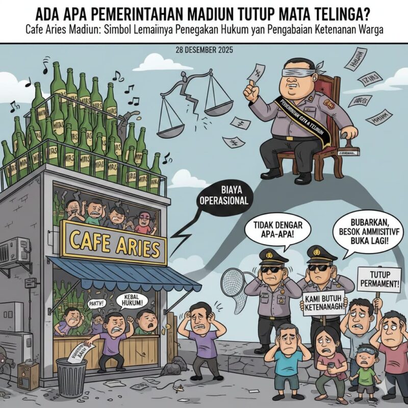 Nasionaldetik.com,– 28 Desember 2025 Marwah supremasi hukum di Kota Madiun dipertanyakan seiring dengan berulangnya aksi meresahkan yang dilakukan oleh pengelola Cafe Aries. Meski telah berkali-kali dilaporkan warga dan dibubarkan aparat, tempat usaha yang berlokasi di Kelurahan Taman ini seolah “menantang” aturan dan mengabaikan komitmen damai yang pernah disepakati.