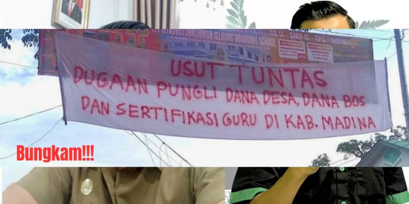 Spanduk tersebut bertuliskan: “USUT TUNTAS DUGAAN PUNGLI DANA DESA, DANA BOS DAN SERTIFIKASI GURU DI KAB. MADINA”. Kemunculan spanduk ini diduga sebagai bentuk kekecewaan masyarakat terhadap transparansi dan pengelolaan anggaran publik di daerah tersebut.