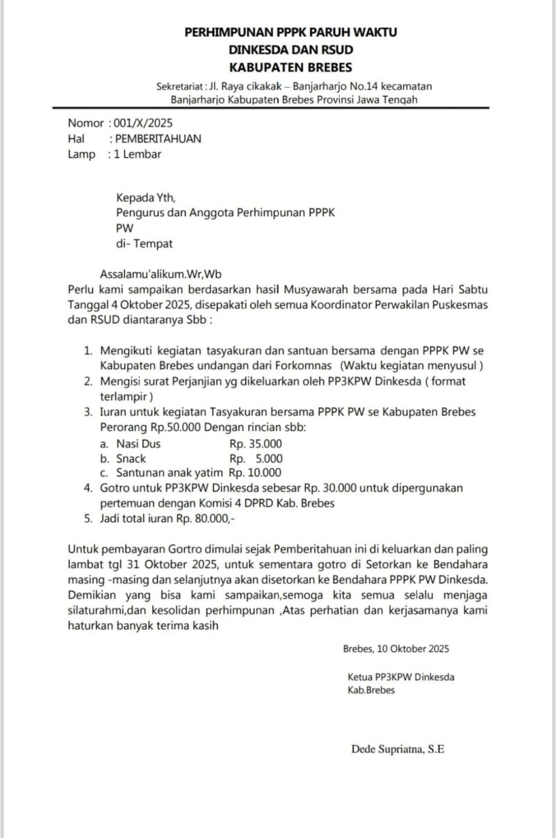 Surat berkops Perhimpunan PPPK Paruh Waktu Dinkesda dan RSUD Kabupaten Brebes bernomor 001/X/2025 ditujukan kepada pengurus dan anggota. Dimana, di dalamnya terdapat rincian iuran. Yakni iuran untuk tasyakuran bersama PPPK PW se-Kabupaten Brebes dan santunan dengan nominal Rp.50.000. Gotro (gotong royong, red) untuk PPPK PW Dinkesda sebesar Rp.30.000. Di dalam surat itu tertulis kalau uang tersebut akan digunakan untuk pertemuan dengan Komisi IV DPRD Brebes.