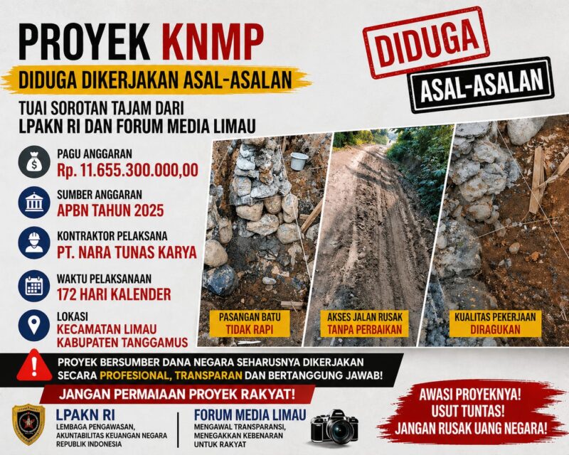 Proyek Kampung Nelayan Merah Putih (KNMP)di Pekon Tegi Neneng, Kecamatan Limau, Kabupaten Tanggamus, yang digadang-gadang sebagai bagian dari program prioritas Kementerian Kelautan dan Perikanan (KKP), kini menuai sorotan dari Lembaga Pemantau Aset dan Keuangan Negara Republik Indonesia (LPAKN RI) bersama Forum Media Limau.