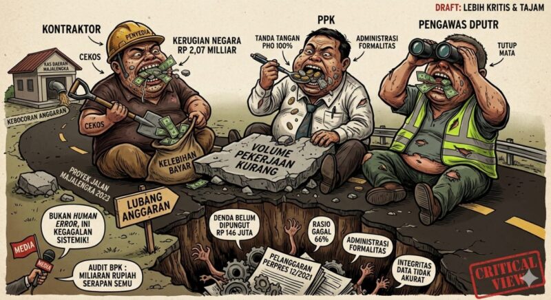 Kondisi ini terjadi karena adanya pengabaian terhadap Perpres No. 12 Tahun 2021. Ada indikasi kuat bahwa proses serah terima pekerjaan (PHO) dilakukan secara formalitas tanpa pengukuran fisik yang presisi. Ketidaktelitian (atau kesengajaan) dalam menghitung volume pekerjaan menunjukkan lemahnya sistem pengendalian intern di DPUTR Majalengka.