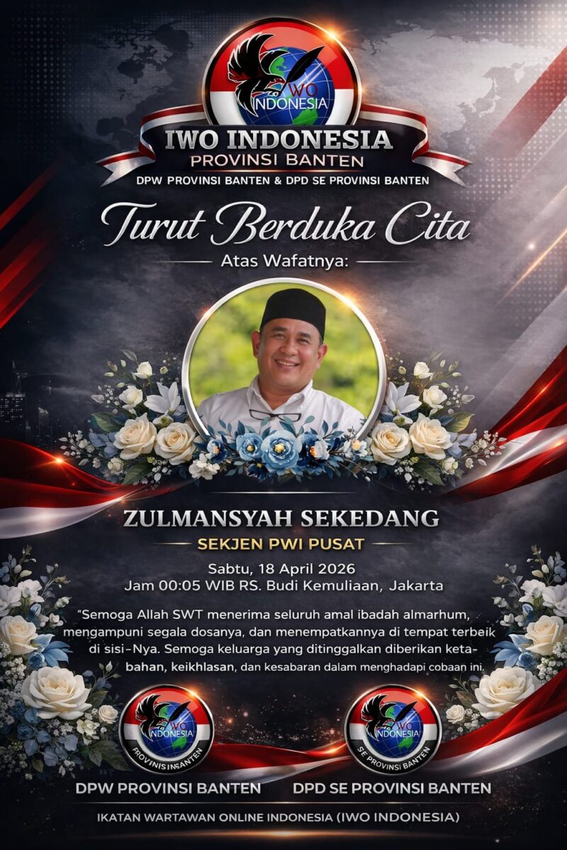 Nasionaldetik.com,—Keluarga besar Dewan Pimpinan Wilayah (DPW) dan Dewan Pimpinan Daerah (DPD) Ikatan Wartawan Online Indonesia (IWO-I) se-Provinsi Banten menyampaikan duka cita yang mendalam atas wafatnya Zulmansyah Sekedang, Sekretaris Jenderal PWI Pusat.18 April 2026.