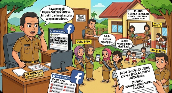 Merangin, Dr. Misrinadi, menyatakan akan segera memanggil Kepala Sekolah SD Negeri 54 Desa Lubuk Birah, Kecamatan Muara Siau, Kabupaten Merangin. Panggilan ini dilakukan menyusul informasi yang viral di media sosial Facebook mengenai dugaan minimnya kehadiran Kepala Sekolah bernama Arpandi.