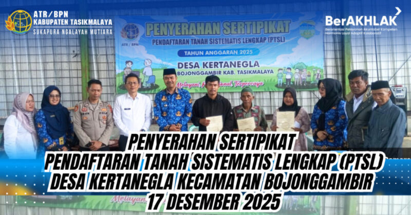 Nasionaldetik.com,— 29 Desember 2025 Kantor Pertanahan Kabupaten Tasikmalaya melaksanakan kegiatan Penyerahan Sertipikat Program Pendaftaran Tanah Sistematis Lengkap (PTSL) Tahun Anggaran 2025 kepada masyarakat Desa Kertanegla, Kecamatan Bojonggambir, sebanyak 500 sertipikat.pada Rabu, 17 Desember 2025.