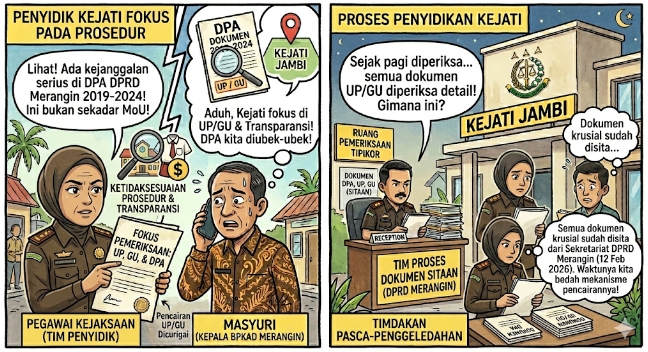 Pemeriksaan ini diduga kuat mendalami dugaan penyimpangan pada mekanisme pencairan Uang Persediaan (UP) dan Ganti Uang (GU). Hal ini sejalan dengan tindakan tim penyidik Kejati Jambi yang sebelumnya telah melakukan penggeledahan di Sekretariat DPRD Merangin pada 12 Februari 2026. Dari penggeledahan tersebut, sejumlah dokumen krusial yang berkaitan dengan pengelolaan anggaran periode 2019-2024 berhasil disita.