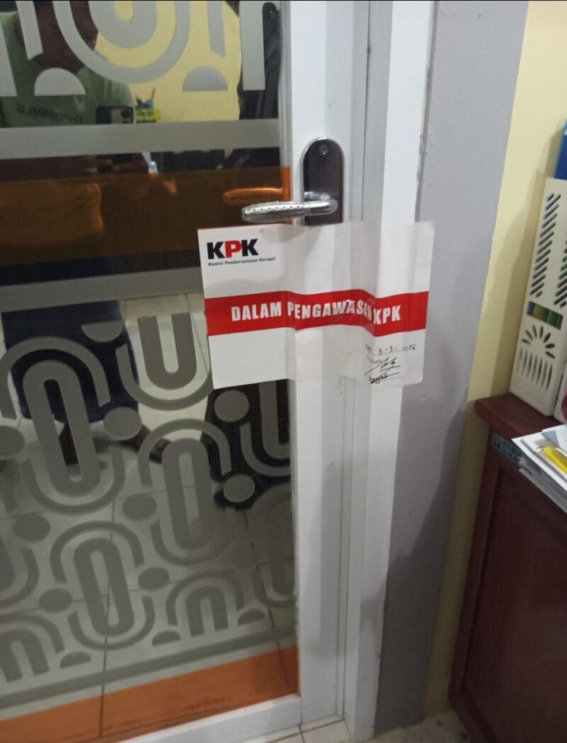 Tindakan pengamanan lokasi melalui pemasangan stiker “Dalam Pengawasan KPK”. Ini merupakan langkah hukum untuk menghentikan seluruh aktivitas di ruangan tersebut guna mencegah penghilangan barang bukti (dokumen, data digital, atau aset) terkait penyidikan kasus korupsi.