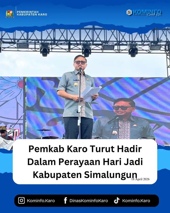 Bupati Karo, Brigjen Pol (Purn.) Dr. dr. Antonius Ginting, Sp.OG., M.Kes., yang diwakilkan oleh Wakil Bupati Karo, Komando Tarigan, S.P, turut hadir dalam perayaan Hari Jadi Kabupaten Simalungun yang ke- 193 yang diselenggarakan di Pematang Raya. Sabtu (18/04/2026).