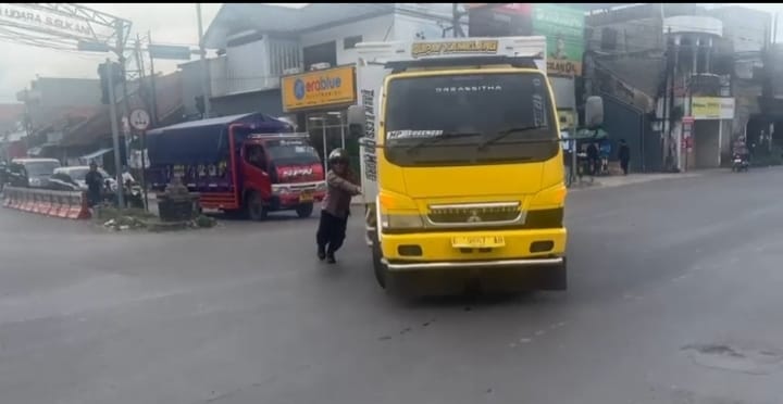 Personel Pos Pam Jatiwangi Sigap Bantu Dorong Truk Mogok di Perempatan Lampu Merah