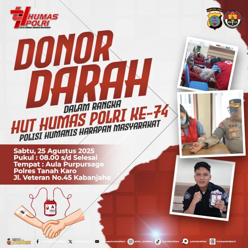 – Dalam rangka memperingati Hari Ulang Tahun Humas Polri ke-74, Polres Tanah Karo menggelar kegiatan donor darah dengan tema “Polisi Humanis Harapan Masyarakat”, bertempat di Aula Purpursage Polres Tanah Karo, Jalan Veteran No.45 Kabanjahe, Sabtu (25/8/2025).