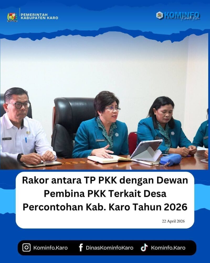 22 April 2026 — Tim Penggerak PKK Kabupaten Karo bersama Dewan Pembina PKK Kabupaten Karo menggelar Rapat Koordinasi tentang Desa Percontohan Kabupaten Karo Tahun 2026 bertempat di Ruang Rapat Rukun Sembiring, Kantor Bupati Karo.