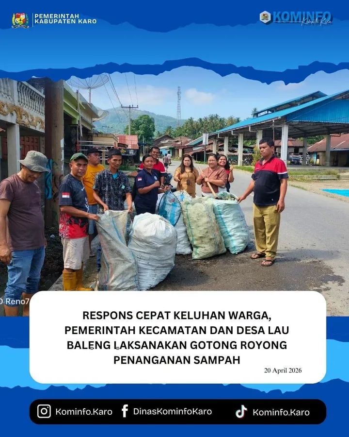20 April 2026 — Menindaklanjuti keluhan warga Desa Lau Baleng yang disampaikan melalui media sosial Facebook pada tanggal 19 April 2026 terkait timbunan sampah yang menyumbat parit di depan rumah warga, Bupati Karo, Brigjen Pol (Purn) Dr. dr. Antonius Ginting, Sp.OG, M.Kes melalui Pemerintah Kecamatan Laubaleng bersama Pemerintah Desa Lau Baleng bergerak cepat melakukan penanganan.