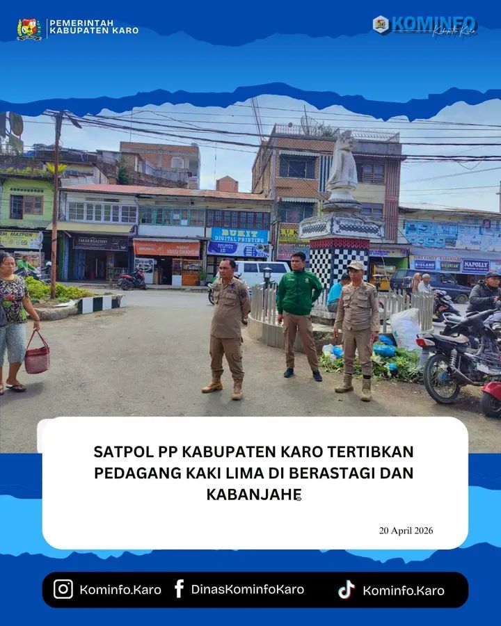 20 April 2026 — Bupati Karo, Brigjen Pol (Purn) Dr. dr. Antonius Ginting, Sp.OG, M.Kes, melalui Satuan Polisi Pamong Praja (Satpol PP) melaksanakan kegiatan penertiban pedagang kaki lima (PKL) di wilayah Kecamatan Berastagi dan Kecamatan Kabanjahe pada Senin (20/04/2026).