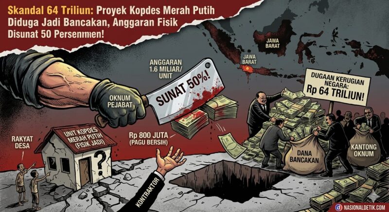 Nasionaldetik.com,— 24 April 2026 Bikin kan gambar kartun sesuai draft ini yang lebih kritis dan tajam. – Aroma busuk dugaan tindak pidana korupsi menyengat dalam proyek pembangunan fisik unit Koperasi Desa (Koperasi Desa) Merah Putih. Tidak tanggung-tanggung, potensi kerugian negara ditaksir mencapai angka fantastis, yakni Rp64 Triliun, akibat dugaan penyunatan anggaran pembangunan yang mencapai separuh dari nilai pagu yang ditetapkan.