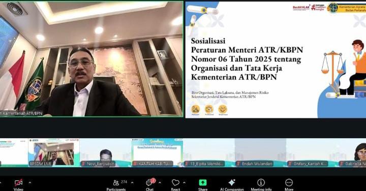 Nasionaldetik.com,—13 Maret 2026 Sekretaris Jenderal (Sekjen) Kementerian Agraria dan Tata Ruang/Badan Pertanahan Nasional (ATR/BPN), Dalu Agung Darmawan, menegaskan empat pesan bagi jajaran pusat dan daerah dalam Webinar Nasional Sosialisasi Peraturan Menteri ATR/Kepala BPN Nomor 6 Tahun 2025 tentang Organisasi dan Tata Kerja Kementerian ATR/BPN, yang berlangsung pada Kamis (12/03/2026). Pesan tersebut mencakup pemahaman mendalam terhadap regulasi, penyesuaian pelaksanaan tugas dan fungsi, penguatan koordinasi antar unit kerja, serta pemanfaatan regulasi sebagai pedoman peningkatan kualitas layanan pertanahan.