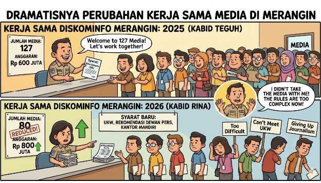Nasionaldetik.com,– 26 April 2026. Terdapat perbedaan mencolok dalam jumlah media yang melakukan kerja sama dengan Dinas Komunikasi dan Informatika (Diskominfo) Kabupaten Merangin antara tahun 2025 dan 2026. Mantan Kabid Lki Diskominfo Merangin, Teguh, angkat bicara mengenai fenomena ini, menyoroti adanya perbedaan anggaran serta persyaratan kerja sama yang dinilai memberatkan media.