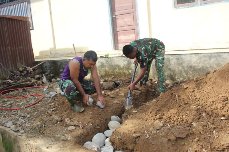 Personel TNI yang tergabung dalam Satuan Tugas (Satgas) bersama masyarakat setempat kini tengah menggenjot pengerjaan fasilitas mandi, cuci, kakus (MCK) yang tersebar di lima titik lokasi.
